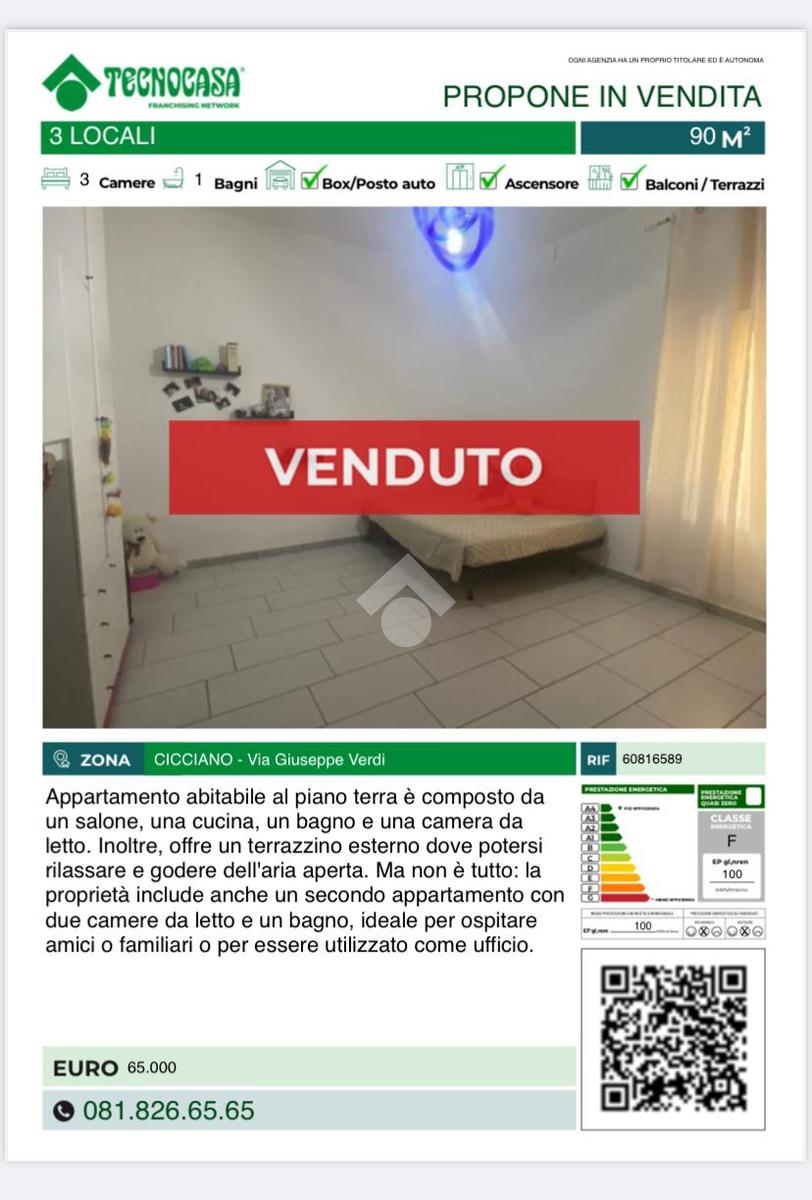 Situato nella zona centrale di Cicciano, questo appartamento abitabile al piano terra è composto da un salone, una cucina, un bagno e una camera da letto. Inoltre, offre un terrazzino esterno dove potersi rilassare e godere dell'aria aperta. Ma non è tutto: la proprietà include anche un secondo appartamento con due camere da letto e un bagno, ideale per ospitare amici o familiari o per essere utilizzato come ufficio.